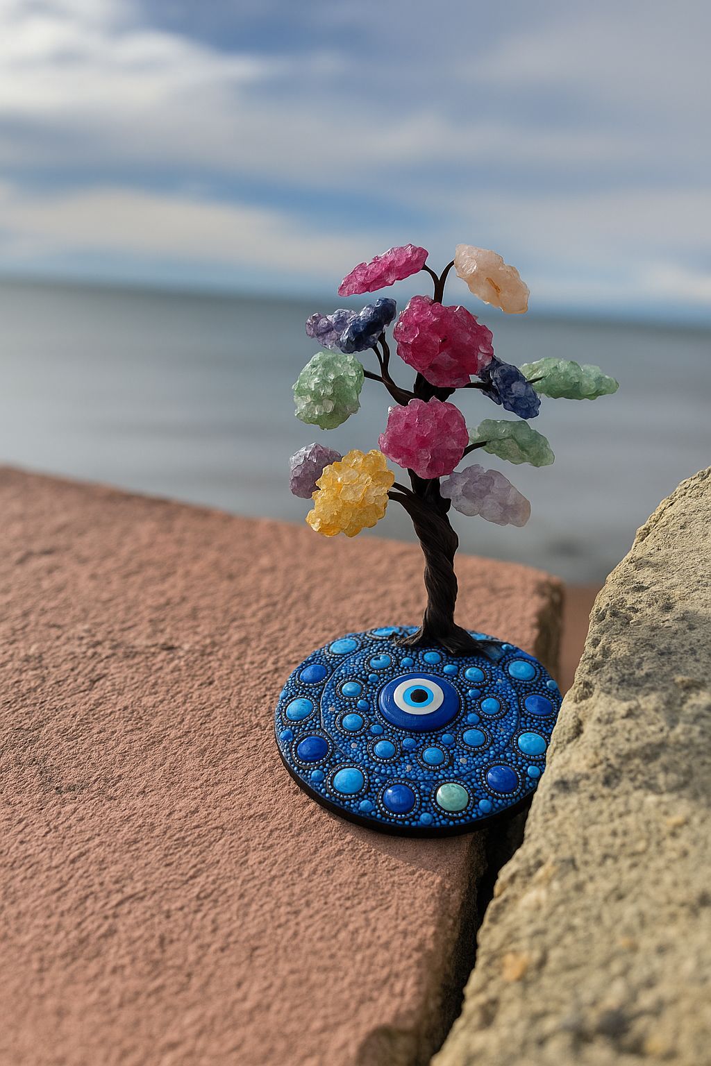 💙🌿 Árbol de Gemas con Base de Ojo Turco – Protección y Energía Positiva